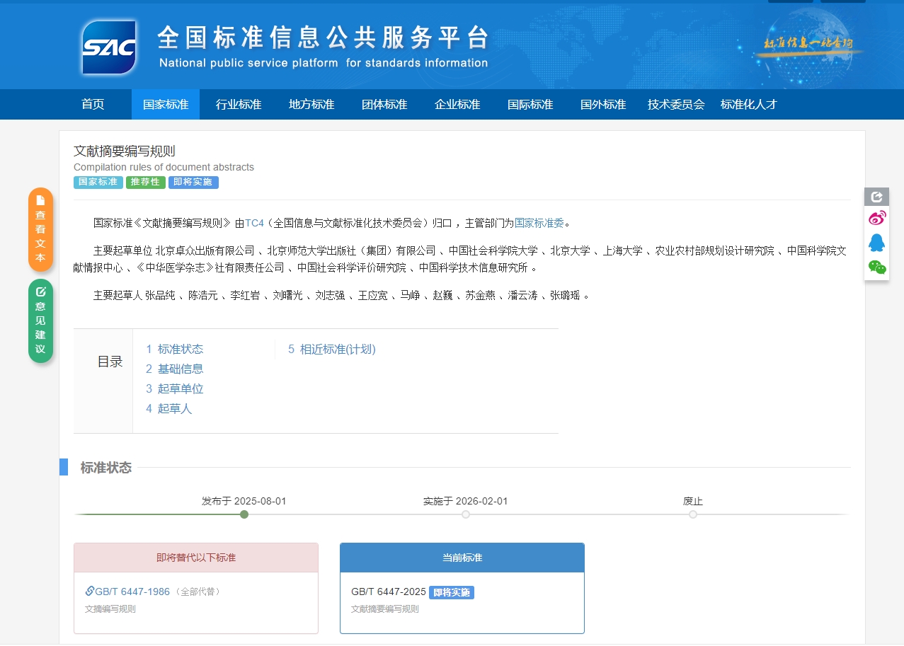 新国标《文献摘要编写规则》(GB/T 6447—2025)发布,将于2026年2月1日正式实施